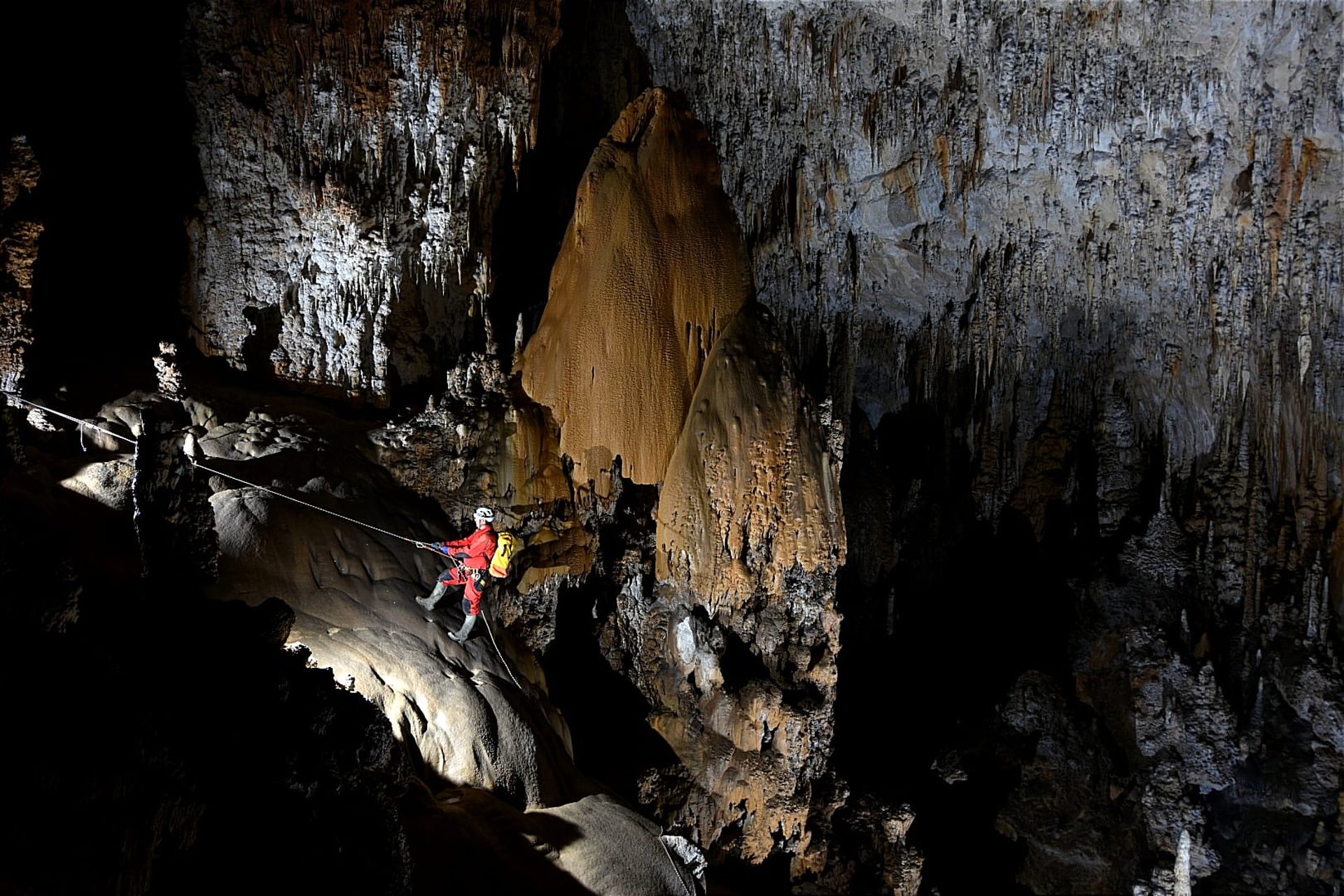 Siguiendo la misma dirección que traemos, alcanzamos el fondo de la sala y ascendemos a otra contigua a nuestra izquierda. Las formaciones aparecen por todas partes, localizando a nuestra derecha una colada resbaladiza y sobre ella un balcón que da acceso a una sala superior. Atravesamos fácilmente la sala hasta entrar en otra contigua de una gran belleza, con enormes columnas emergiendo hasta el alto techo y esbeltas estalactitas cayendo hacia el suelo. Pequeñas salas esconden bonitos rincones. Después de explorar los vericuetos como buenos espeleólogos, desandamos el itinerario hasta la sala inicial. Es el momento para tomar la otra alternativa y descender a la Galería del Metro y la Sala de los Fantasmas. La imaginación se desborda buscando parecidos razonables con la gran cantidad de formaciones que allí descubrimos...